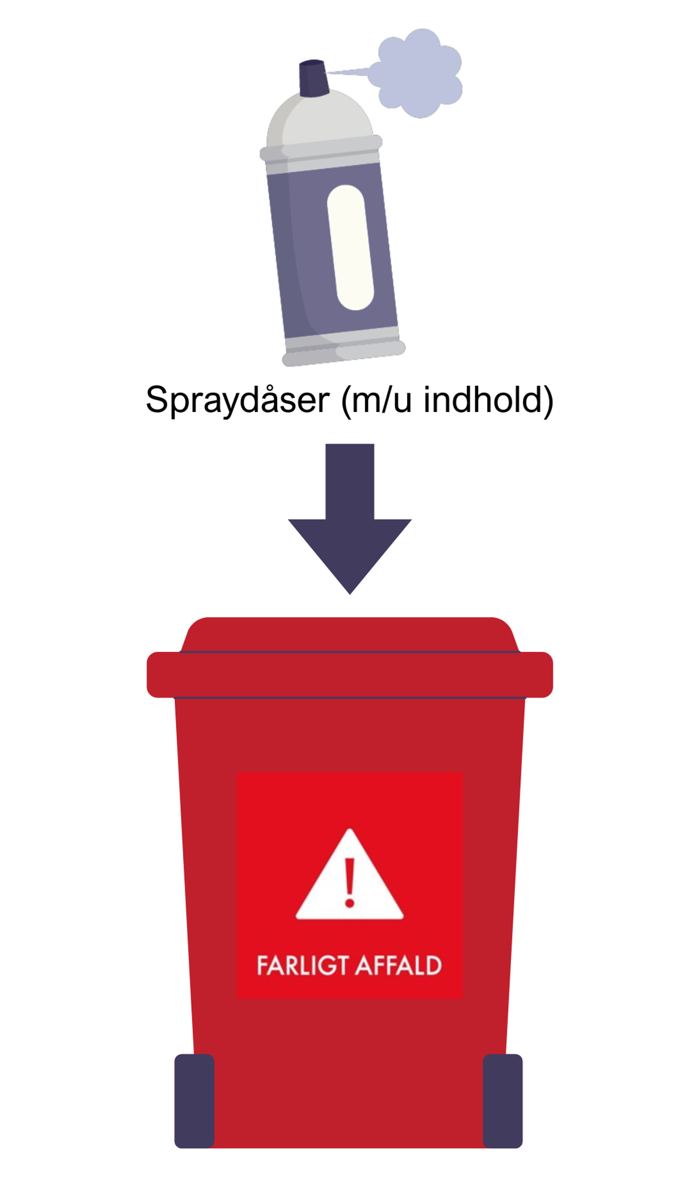 Tomme spraydåser kan stadig indeholde rester af tryk eller kemikalier. Hvis de havner i metalcontaineren, kan det skabe risiko for brand eller eksplosion, når affaldet bliver presset eller behandlet.